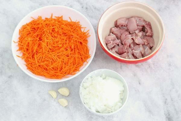 Чтобы приготовить рис с курицей в горшочке в духовке, нужно сначала очистить лук. Далее овощ следует порезать полукольцами. Морковь помойте, очистите. Далее нарежьте на колечки.