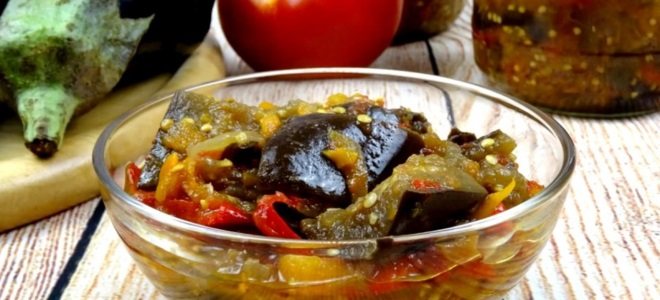 Порезанные баклажаны обжаривают. Нашинкованные в форме соломки перец и кольцами лук соединяют с синенькими, тушат до готовности. В конце добавляют оставшиеся ингредиенты, после тщательного перемешивания отправляют для стерилизации на 10 минут.