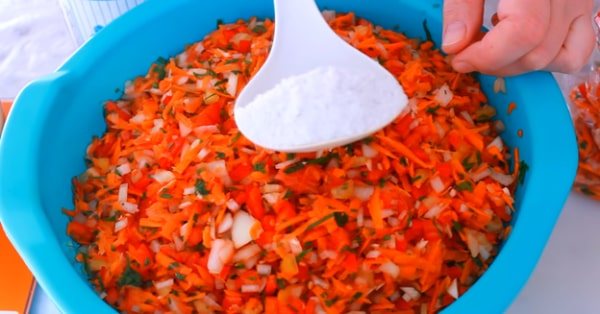 - Соединить все овощи и измельченную зелень в одной емкости, засыпать солью, с особой тщательностью перемешать и оставить на несколько минут для пропитки.