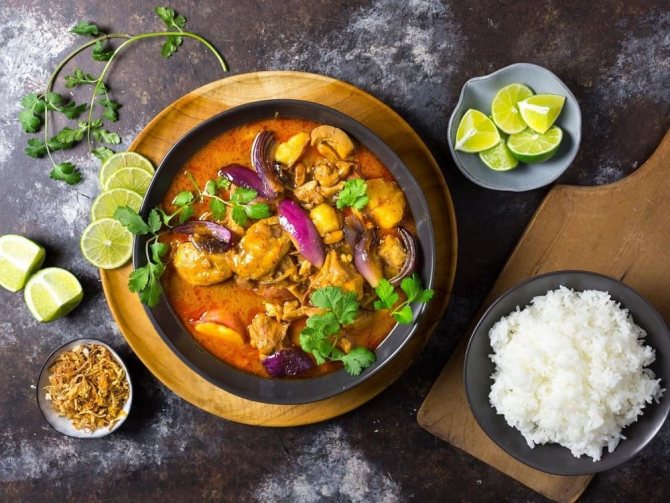 - Корма, готовящаяся из курятины (козлятины) в кокосовом молоке с добавлением кайенского перца, кардамона и орехов.