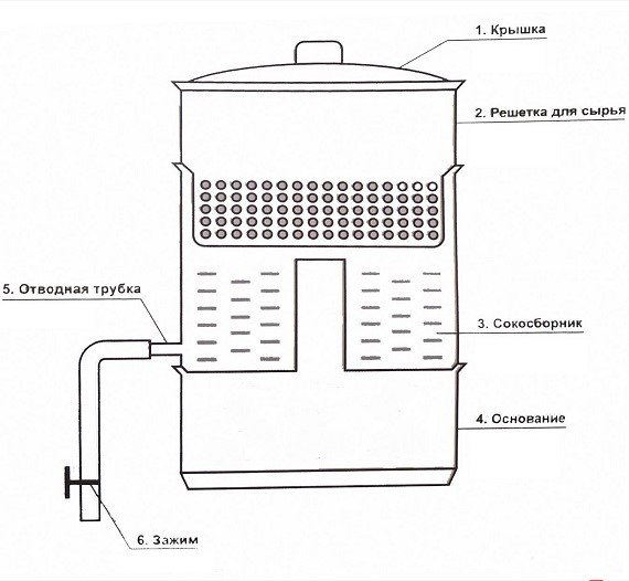- Сокосборник. Самый сложная деталь конструкции, выполненная в форме цилиндра с паровой трубой внутри и дополнительным боковым отверстием. Главная задача сокосборника – собирать стекающий сок.
