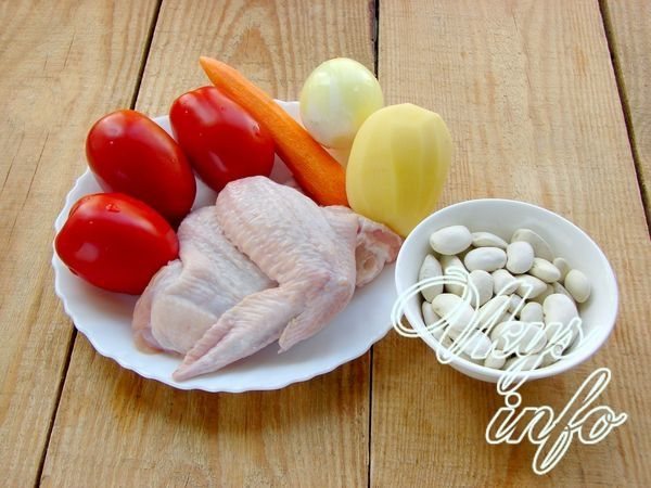 Наш фасолевый суп мы решили приготовить с томатом, так как этот тандем является очень удачным и делает блюдо ярче не только по виду, но и по вкусу, ну а чтобы угодить всем, суп будет с курицей, а вернее сказать с её крылышками. Вы можете использовать любую другую часть на ваше усмотрение. Курица у нас обычная не домашняя. Домашняя готовится дольше.