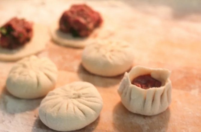 Что ж, смотрите пошагово сам процесс лепки, в самый центр кружка из теста положите начинку, затем двигаясь по кругу по часовой стрелки начинайте делать защипы, вот таким образом: