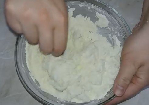 Важно! Поначалу вам будет казаться, что оно жидковатое, но со временем оно станет туговатым. Просто нужно тщательно все перемешивать, сначала столовой ложкой, а потом выложить тесто на стол и размять руками.