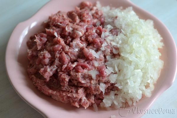 Перекрутила мясо на мясорубке (на крупной сетке). Мелко нарезанный лук смешала с солью, добавила его в свиной фарш.