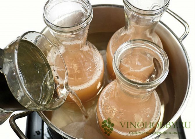 Мутный алкоголь нужно разлить в стерилизованные бутылки и плотно их закупорить, чтобы спирт в процессе нагревания не испарялся. Затем сосуды ставят на подставку, ее помещают в кастрюлю с водой, которую нагревают на медленном огне. Вода должна нагреться до 50 градусов, после чего кастрюля снимается, вино остается в ней и постепенно охлаждается до комнатной температуры.