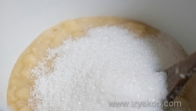 В это пюре высыпаем половину отмеренного сахара и перемешиваем его миксером. Взбиваем массу до момента, когда она побелеет.
