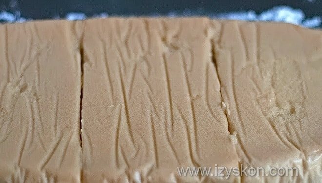 Готовое лакомство извлекаем, отделяем от пергамента, обрезаем края и разрезаем на полоски в зависимости от того, сколько слоев вы хотите сделать. У меня получилось четыре слоя.