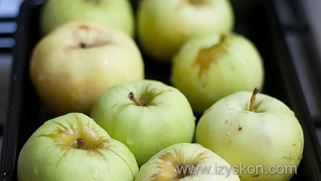 1. Яблоки промываем под проточной водой и выкладываем плотными рядами на противне. Выпекаем их в разогретом духовом шкафу (180 градусов) около 20-30 минут.