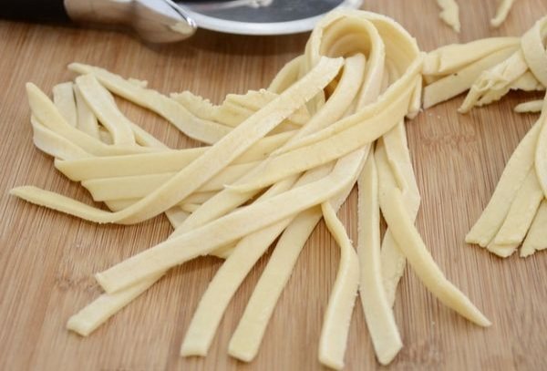 - Тесто разрезают пополам, сворачивают рулетом и нарезают лапшу. Макароны получаются длинными кольцами, которые требуется разобрать. Если пласт разрезать на полоски, затем сложить их друг на друга и нарезать ножом, можно получить равномерную по длине лапшу.