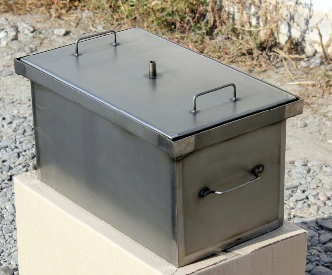 Для горячего копчения курицы в квартире лучше использовать бытовые коптильни с гидрозатвором и отводом дыма, как заводского изготовления, так и самодельные. Гидрозатвор не даст дыму изнутри коптильни попасть на кухню, а вот этот патрубок на крышке выведет лишний дым в форточку или кухонную вытяжку: