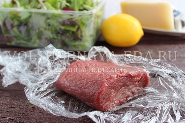 Мясо должно быть свежим и самого высокого качества. На одну порцию понадобится небольшой кусочек отборной говяжьей вырезки (предпочтительно средняя часть), весом примерно 150 г. Мясо я промыла и обсушила бумажными полотенцами, зачистила от белой пленки. Подготовленный кусок плотно обернула пищевой пленкой и отправила в морозильную камеру на 1 час, чтобы было легче нарезать тонкими слайсами.