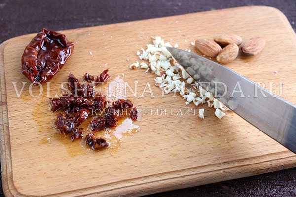 Отдельно приготовила небольшое сопровождение к нашему карпаччо. Порубила миндальные орешки, чтобы добавить хрусткости. Измельчила как можно мельче пару вяленых томатов.