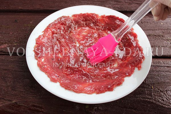 - Нарезать подмороженную говядину тонкими кусочками и поместить в один слой на большую плоскую тарелку.