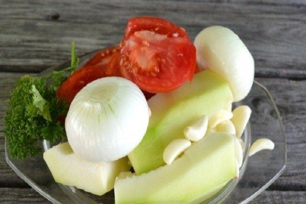1.Все овощи нужно очистить и промыть. С кабачка срезать кожуру, удалить изнутри семена. Лук и чеснок очистить от шелухи. Помидоры нарезать на крупные части. Используйте свежую зелень.