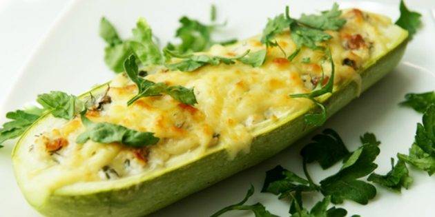 Кабачки очистите от кожуры и разрежьте вдоль. Ложкой или ножом извлеките мякоть, чтобы получились «лодочки».