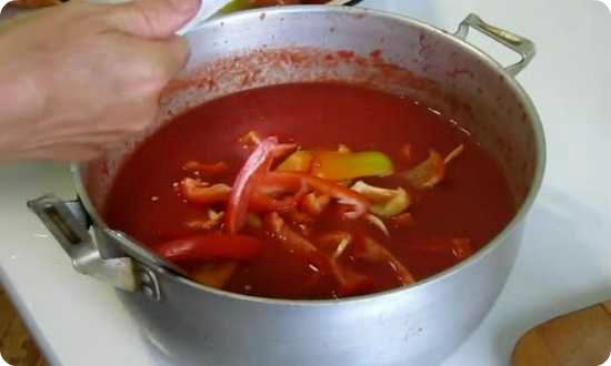 Сладкий перец вымойте, очистите от семян и нарежьте брусочками. Морковь натрите на крупной терке. С помидоров удалите кожицу и приготовьте из них сок — мякоть мелко нарежьте, нагрейте почти до кипения, а затем протрите через сито, чтобы удалить семена. В получившийся сок добавьте соль, сахар и пряности.