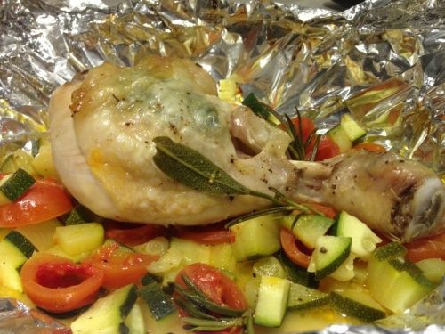 Фольгу нарезаем на 3 больших квадрата, каждый смазываем растительным маслом и выкладываем одну часть лука, одну часть помидоров и одну часть цукини.Затем укладываем куриный окорочок, между кожей и мясом кладем один лист шалфея. Заправляем курицу и овощи черным молотым перцем, солью и розмарином по вкусу. После чего плотно запечатываем и перекладываем в форму для запекания. Таким же образом формируем оставшиеся два окорочка.