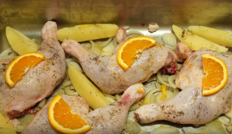 Картофель нарезаем на 4 части (солим и перчим), выкладываем на противень. Поливаем все апельсиновым соком. Выкладываем на каждый кусочек куриного мяса дольку апельсина.