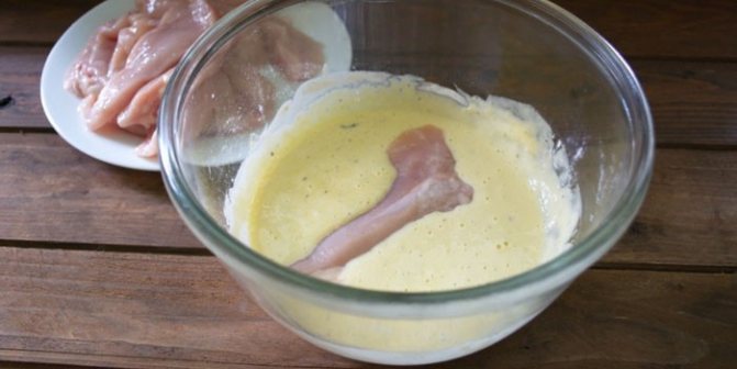 - Ломтики курицы погружать в тесто с каждой стороны и выкладывать на разгоряченную сковороду.