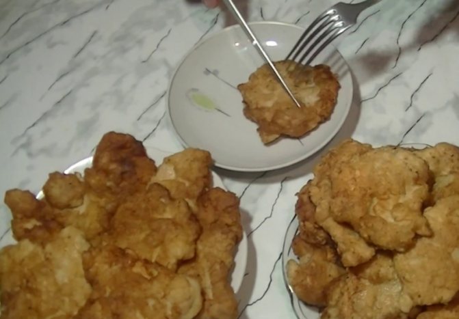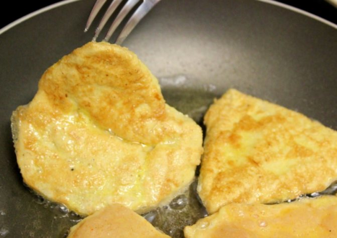 - Разогреваем сковороду с маслом, курятину обмакиваем в кляр, жарим с каждой стороны до корочки.