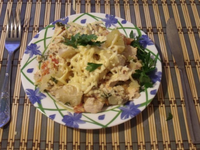 Совсем не сложное блюдо, в котором куриное филе запекается в горшочке с предварительно сделанной домашней лапшой и овощами, морковью и луком. Интересной изюминкой его является то, что горшочки сверху накрываются не крышками, а самодельными лепешками из теста, которые потом можно есть вместо хлеба.
