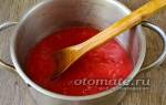 - Ставим нашу кастрюлю на плиту, заливаем томатное пюре, включаем средний огонь и ждём, пока закипит, при этом не забываем обязательно снимать пену.