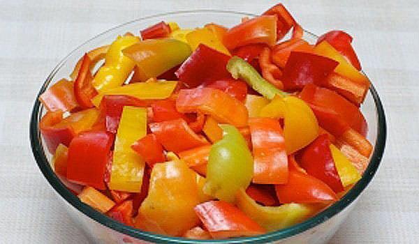 - Сладкий перец вымыть, убрать хвостик, очистить от семян и белых внутренних перегородок. Снова тщательно промыть. Нарезать по желанию: тонкими или толстыми полосками, кубиками, кольцами.