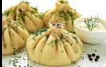 Вариант для будней – ленивые манты, на приготовление которых уходит вдвое меньше времени. Тесто с начинкой просто сворачивают в рулет, после чего нарезают, а затем доводят до готовности. Затем масса делится на части, каждая из них раскатывается колбаской, а потом нарезается на равные кусочки. Остается их раскатать, положить начинку, слепить красивые манты, защипывая сначала посередине, потом с двух сторон делают ушки, и все это соединяют вместе корзиночкой.