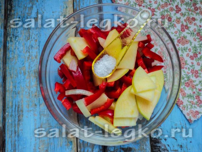 Ингредиенты: — яблоки – 500 г, — сладкий перец – 900 г, — лук репчатый – 450-500 г, — мед – 1,6 ст. л., — поваренная соль – 15 г, — растительное масло – 55 мл, — уксус – 30 мл.