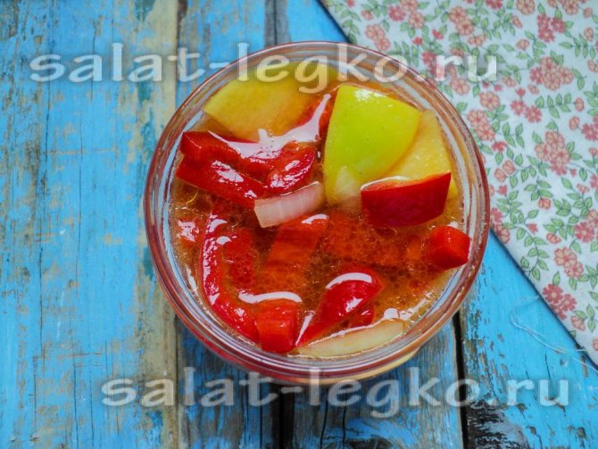 Заливаем маринадом, который у нас остался в кастрюле, герметично затягиваем банки крышками. Остужаем под махровым полотенцем сутки, обязательно перевернув банки дном вверх. Храним салат из сладкого перца с яблоками в темном и прохладном месте. А если это не заготовка, даем салату хотя бы сутки для маринования, подаем к столу.