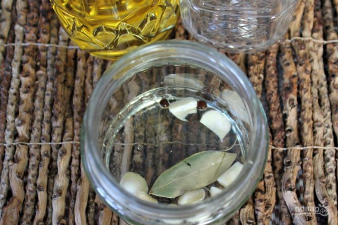 Берем банку 500 мл. На дно кладем лавровый лист, перец душистый и нарезанный чеснок.