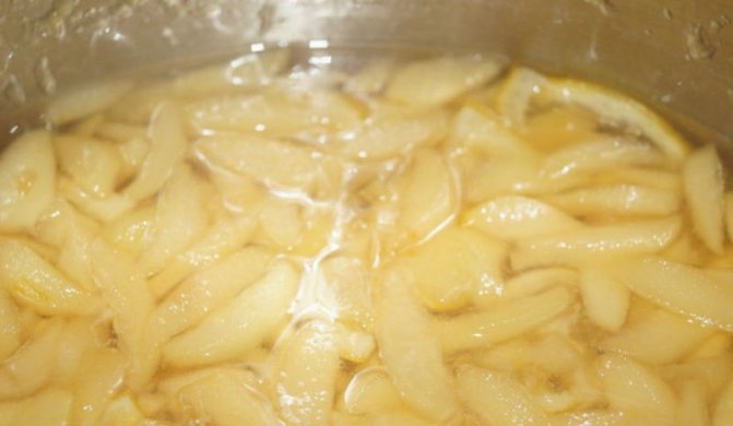 Ножом из нержавеющей стали плоды разрезать на дольки, удалить семенную коробку, плодоножку и поврежденные места. Бланшировку груш следует производить в слабом растворе лимонной кислоты (1 г на 1 л воды) при температуре 85°С в течение 5—10 мин.