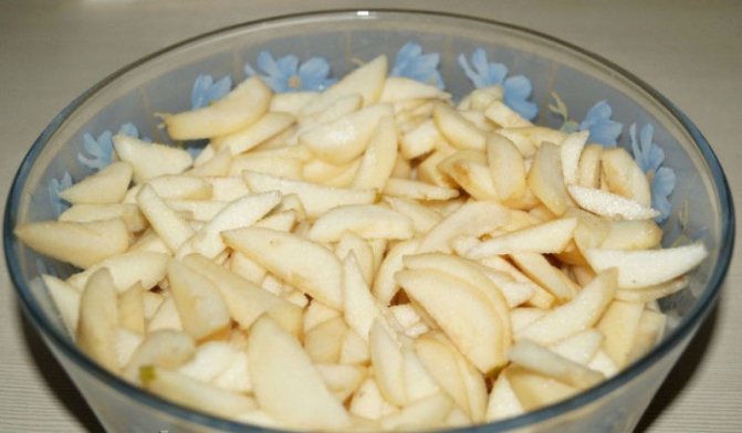 - Нарезанные груши поливают соком лимона, засыпают сахаром оставляют до отделения сока.