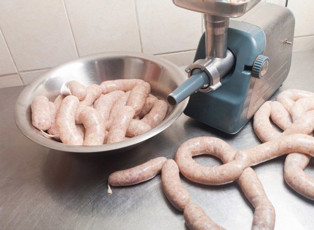 Рецепт сосисок в домашних условиях предписывает нам долго вымешивать фарш. Это позволит ингредиентам не только войти в соединение, но и наполнит массу пузырьками воздуха. Фарш должен быть влажным. Так сосиски выйдут сочными и вкусными. Потом следует подержать фарш в холодильнике пару часов, а еще лучше – ночь. И только потом приступить к формированию сосисок. И в домашних условиях, и на мясокомбинате существует два способа завертывания фарша. Это кишки и пищевая пленка. Первый способ считается более натуральным. Но для того чтобы сформировать сосиски таким образом, понадобится специальная насадка на мясорубку, с «краном». Можно обойтись и кондитерским шприцом с крупным отверстием. В конце концов, можно использовать плотный кулёк с отрезанным кончиком. А для того чтобы сделать сосиски в пищевой пленке, достаточно просто твердой рабочей поверхности и ниток. Поэтому мы начнем с этого самого легкого способа формирования изделий.