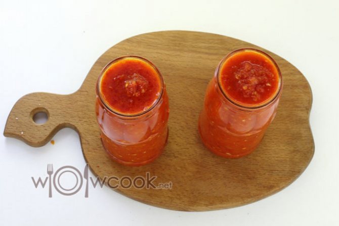 - Готовый соус раскладываем в сухие, стерильные банки, закатываем, храним в прохладном месте.
