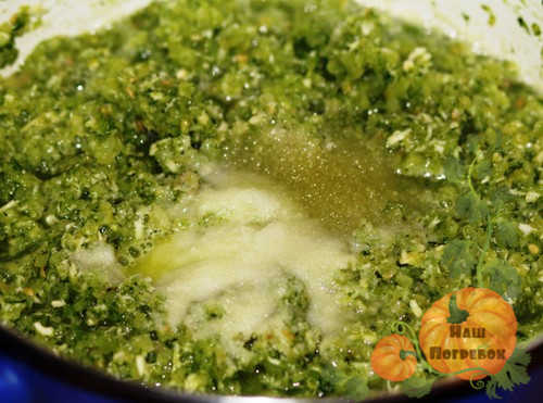 - Овощную смесь переливаем в глубокую кастрюлю, солим, посыпаем приправой, добавляем масло. Размешиваем, настаиваем полчаса. После вливаем кашицу из зеленых помидор, перемешиваем.
