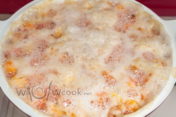 - Высыпаем сахар и кипятим золотой сироп. Сюда же выкладываем обработанные фрукты.