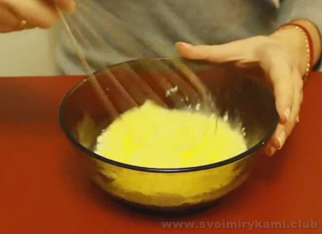 - Сюда же разбиваем яйца, и все хорошо перемешиваем.