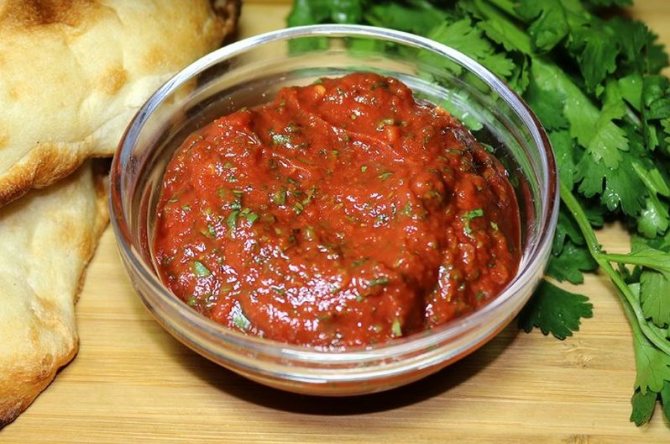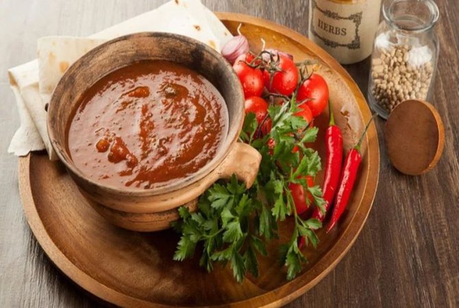 Сацебели, заготовленный впрок, очень напоминает кетчуп или томатную пасту. И использовать его можно вместо этих производных помидорной продукции – добавлять в борщ, другие соусы, кушать просто с хлебом и т.д.
