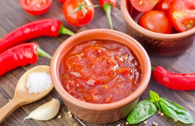 - из помидор: 1 кг томатов, 1 ст.л. сухой аджики, 2-3 зубочка чеснока, соль, ½ пучка кинзы. Помидоры превратить в пюре, которое уваривают около 30 минут (после закипания). Как только соус загустеет в него вводят остальные компоненты и уваривают еще минут 10. Разложить в стеклянные баночки. Хранить в холодильнике.
