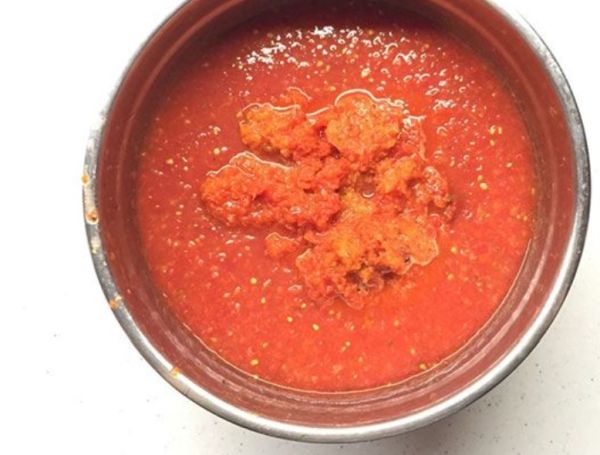 - Томаты очистить от кожицы и перемолоть в блендере.