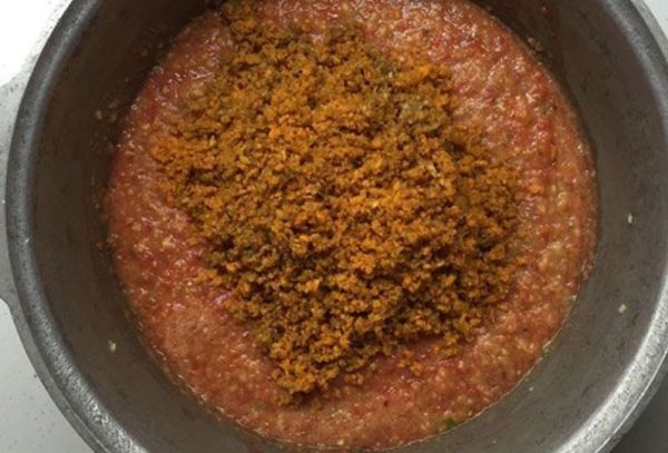 - Аджику надо довести до кипения, периодически помешивая. Варим ее 20 минут, потом добавляем острую смесь из перекрученного перца и чеснока. Потом уксус. Продолжаем варить еще 10 минут.
