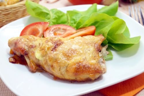 Чесноком также можете натереть окорочка снаружи, либо же порезать его на тоненькие пластинки, и поместить их в разных местах под шкуркой.
